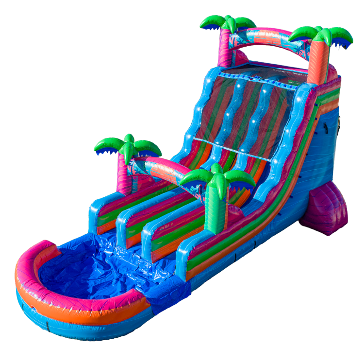 Make a splash at your next event with our 18-foot Electric Tropics Dual Lane Inflatable Water Slide, the perfect addition to any party, birthday, school event, or community gathering. This tropical-themed inflatable water slide rental features two parallel lanes, allowing riders to race side-by-side for double the excitement and faster turns.